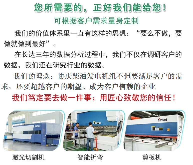 3、防音效果好,箱体内采用高频、中频、低频PUR型阻燃吸音棉,有效降低机组各处传出的不同噪音。消声器采用阻性消 声器,降低机组排烟口噪音。